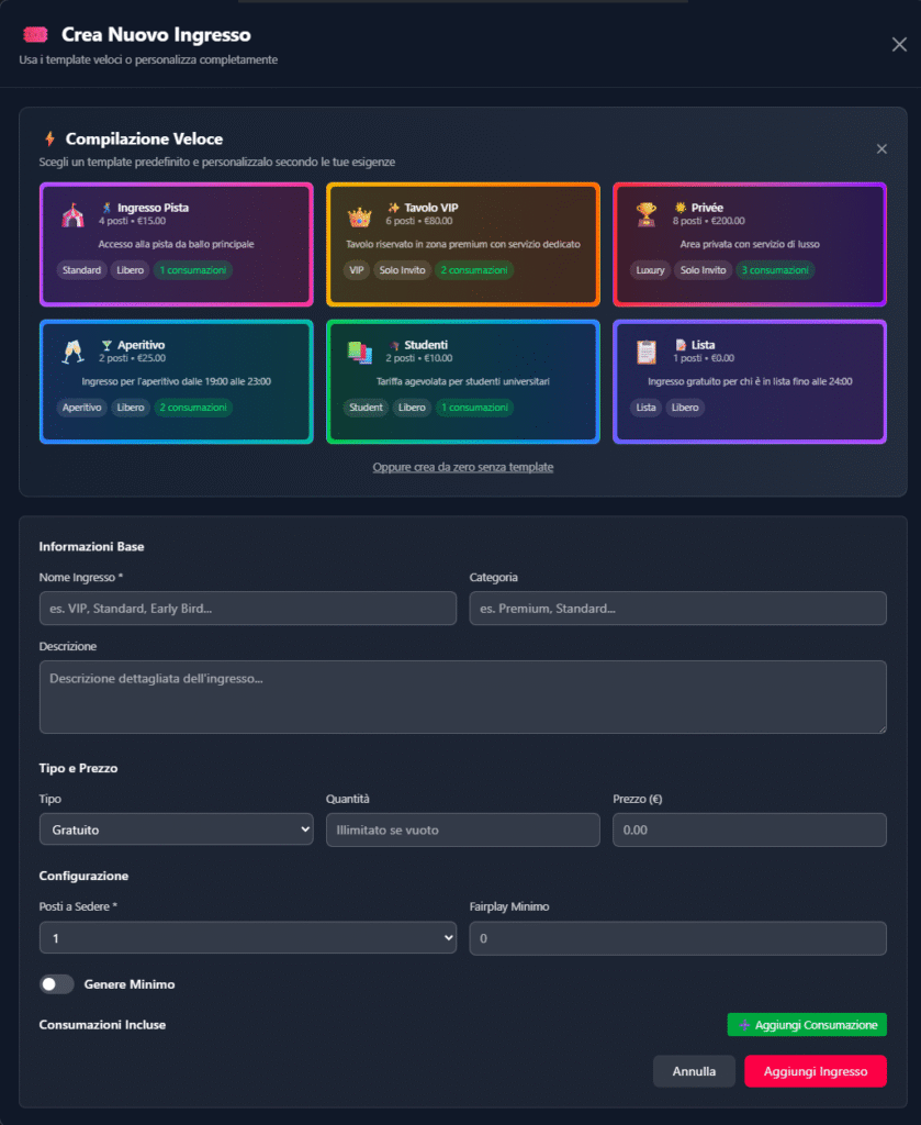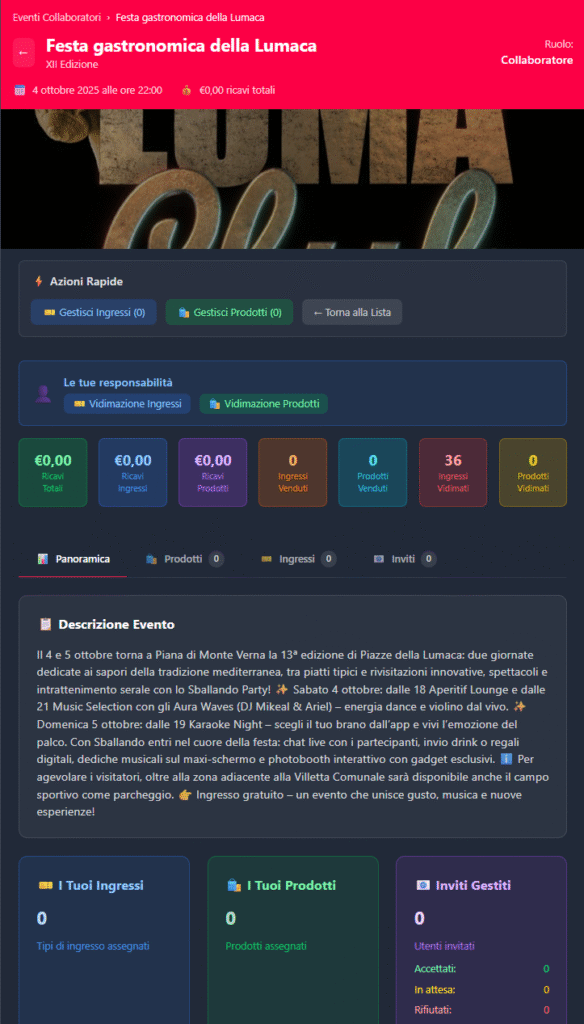 - Organizzatori: possono creare eventi, gestire ingressi, tavoli, prodotti e staff in un’unica piattaforma.