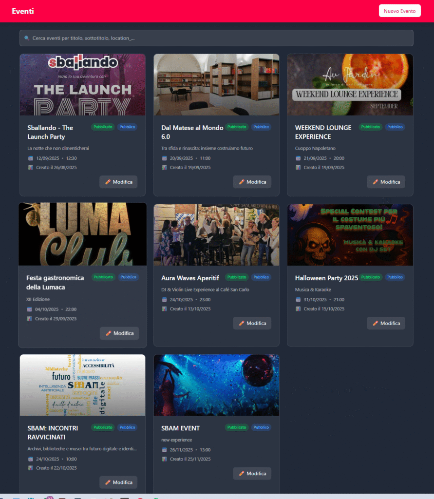 - Creazione eventi con orari, prezzi, descrizione, gestione tavoli e pista